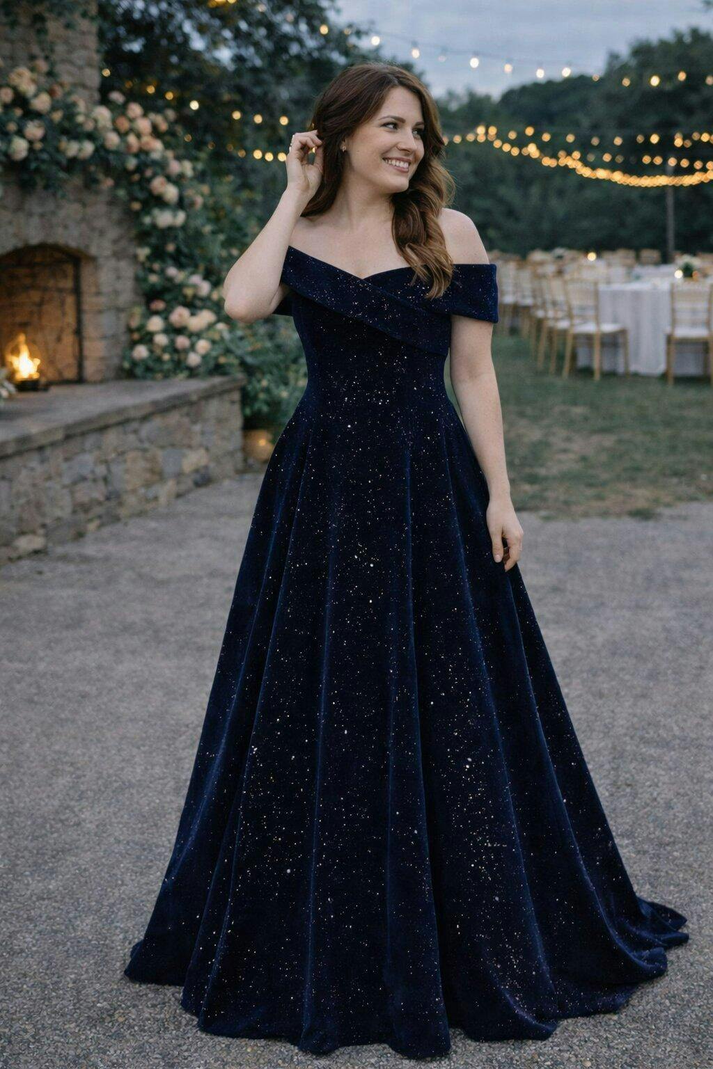 This navy prom dress delivers a refined sense of glamour through its rich velvet texture and softly shimmering finish. Designed in a classic A-line silhouette, the gown skims the waist before flowing into a floor-length skirt that moves with understated elegance. The off-the-shoulder neckline highlights the collarbone and shoulders beautifully, creating a sophisticated, modern profile that feels both timeless and fashion-forward.