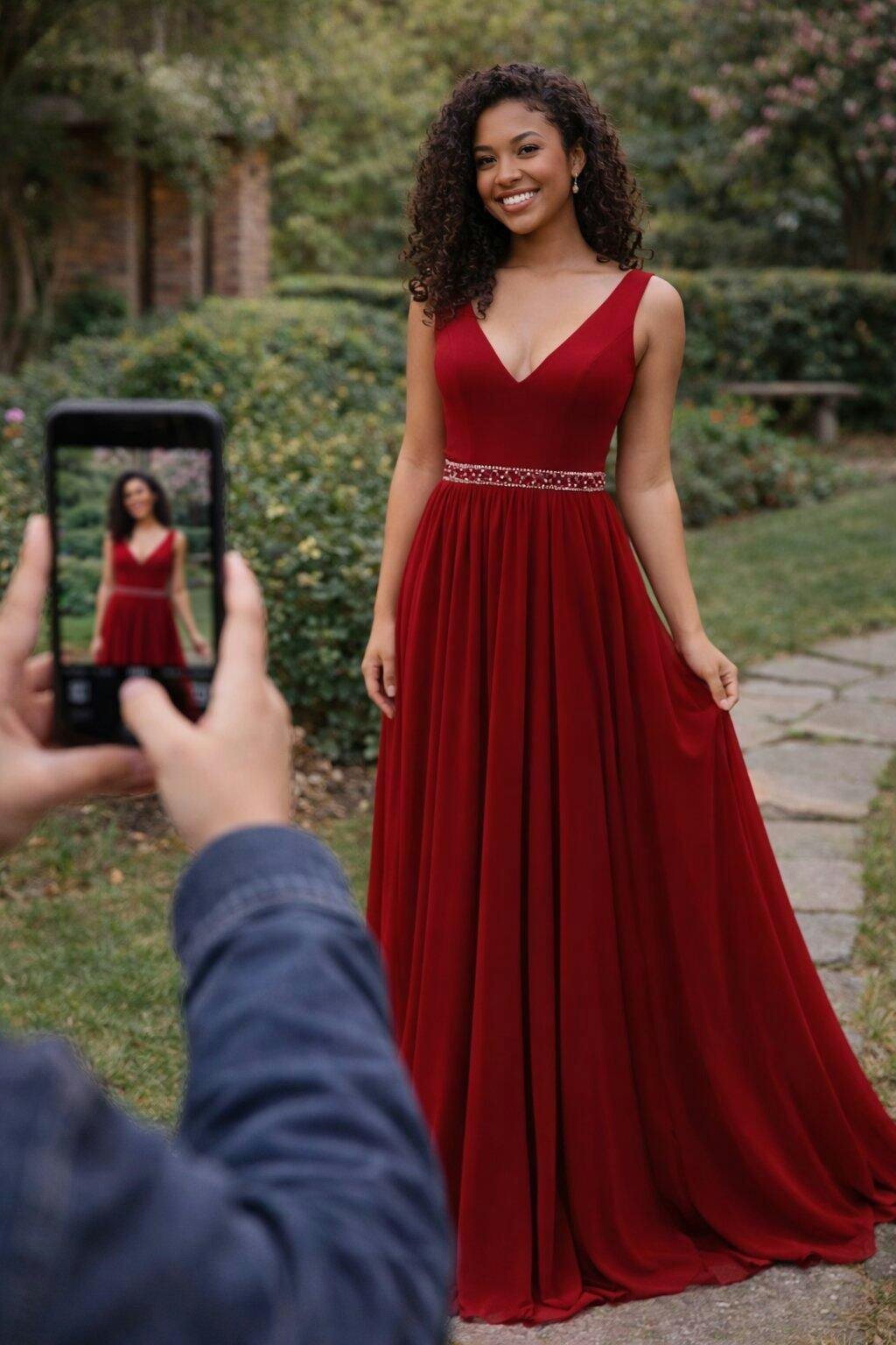 Elegant and refined, this A-line chiffon prom dress showcases a deep V-neck bodice that highlights a modern, minimalist silhouette. The delicately beaded waistline adds a touch of sparkle, defining the figure while enhancing the dress’s graceful flow. Crafted with lightweight chiffon, the skirt drapes beautifully to the floor, creating effortless movement perfect for prom nights or any formal celebration.