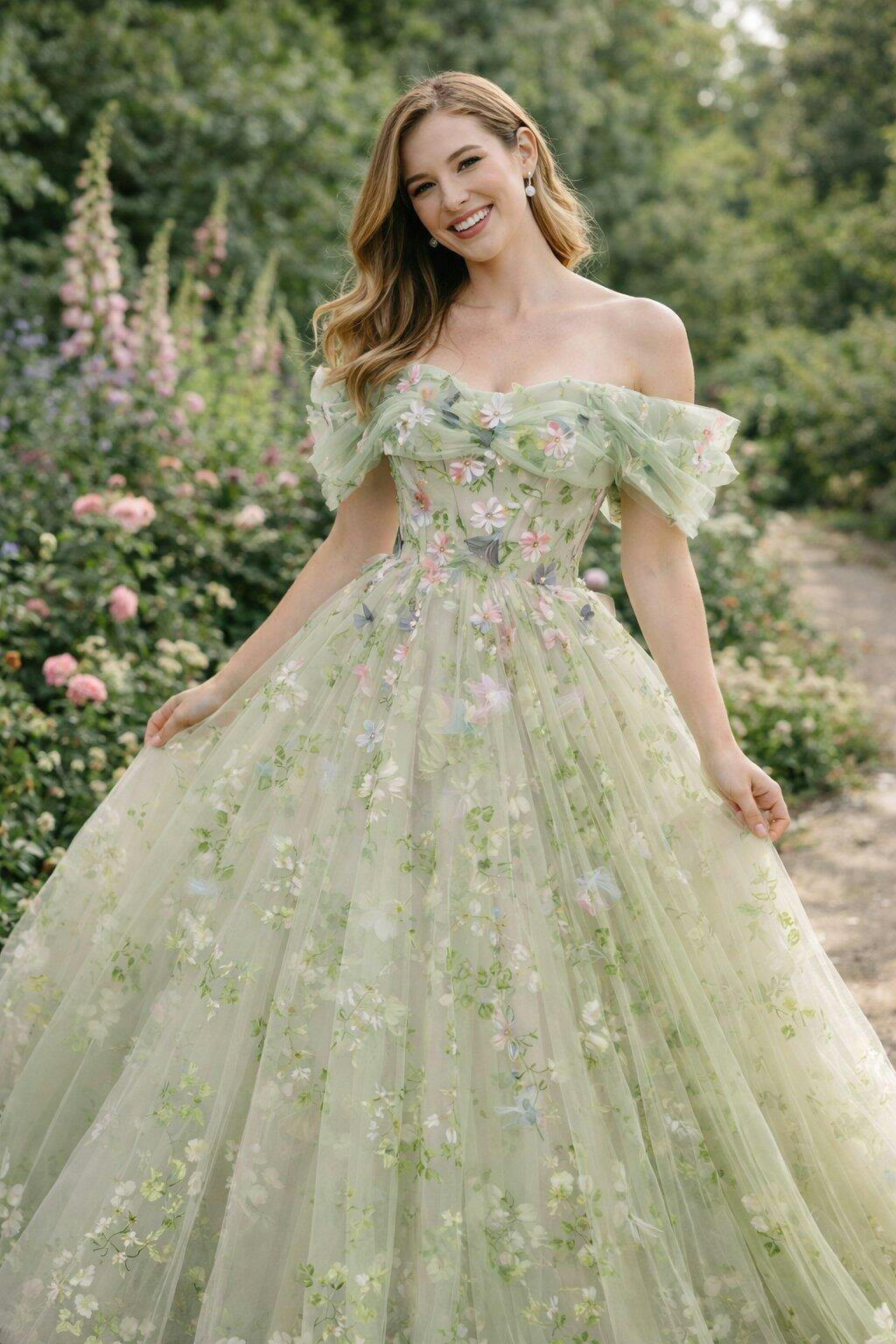 Crafted from airy tulle layered with delicate lace, the dress delivers a refined yet dreamy look. The off-shoulder neckline beautifully highlights the shoulders and neckline, adding a touch of feminine elegance that photographs effortlessly.
