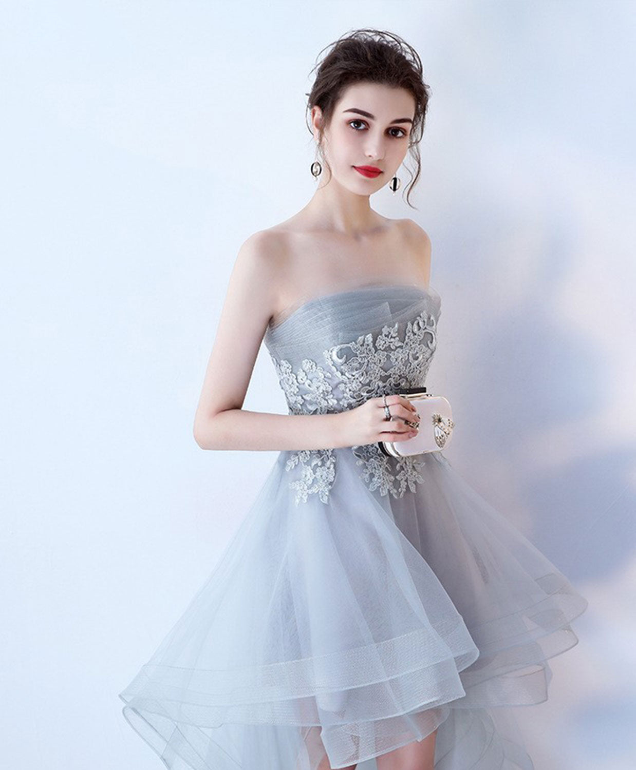 This soft gray prom dress blends romantic detailing with a modern high-low silhouette, creating a look that feels both elegant and effortlessly stylish. The strapless bodice is beautifully shaped to highlight the neckline and shoulders, while intricate lace appliqué adds refined texture and visual depth across the front.
