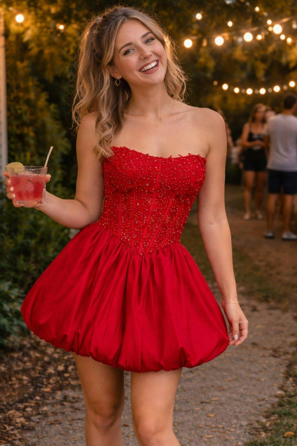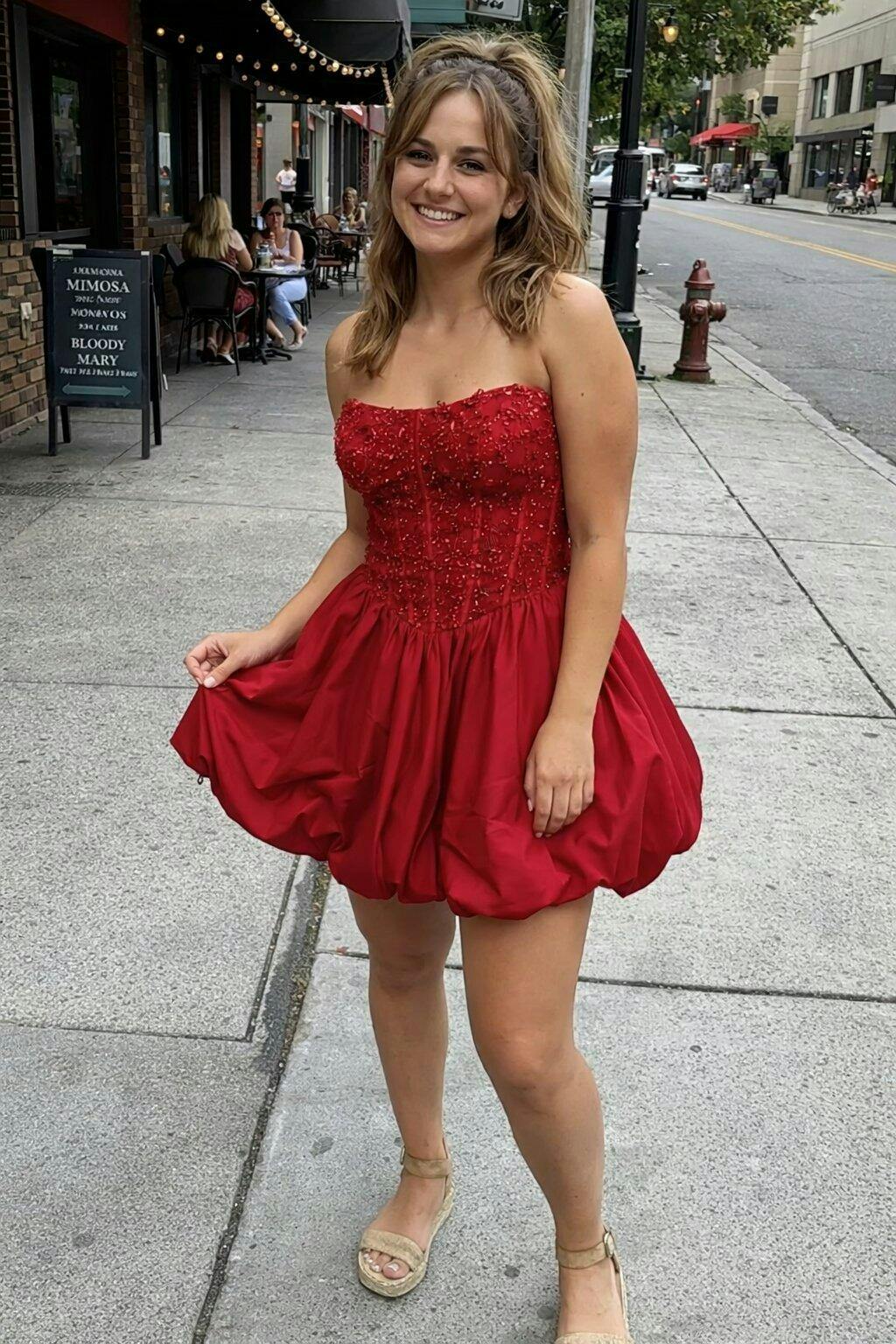 This red homecoming dress features a playful A-line silhouette that highlights the waist while creating a youthful, voluminous shape. The strapless neckline showcases the shoulders and collarbone, offering a confident yet elegant look that feels perfect for school dances and semi-formal events.