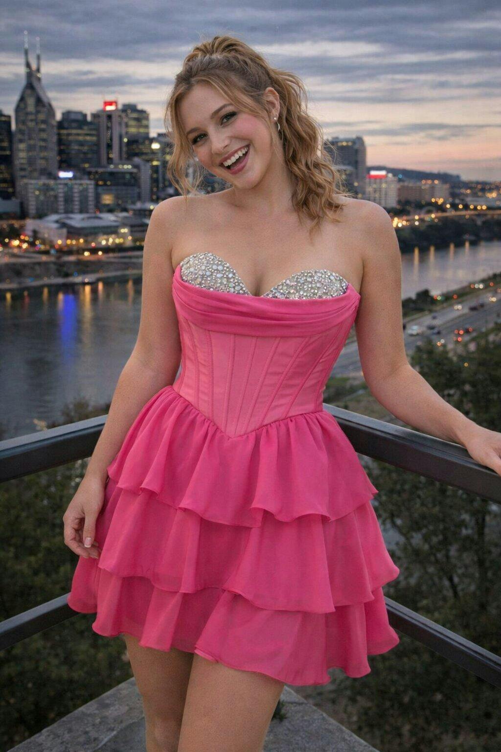 Designed with a soft, layered chiffon skirt, this short dress creates graceful movement with every step. The tiered ruffles enhance volume without feeling heavy, making it an ideal choice for homecoming, school dances, or semi-formal events where a polished yet playful style is desired.