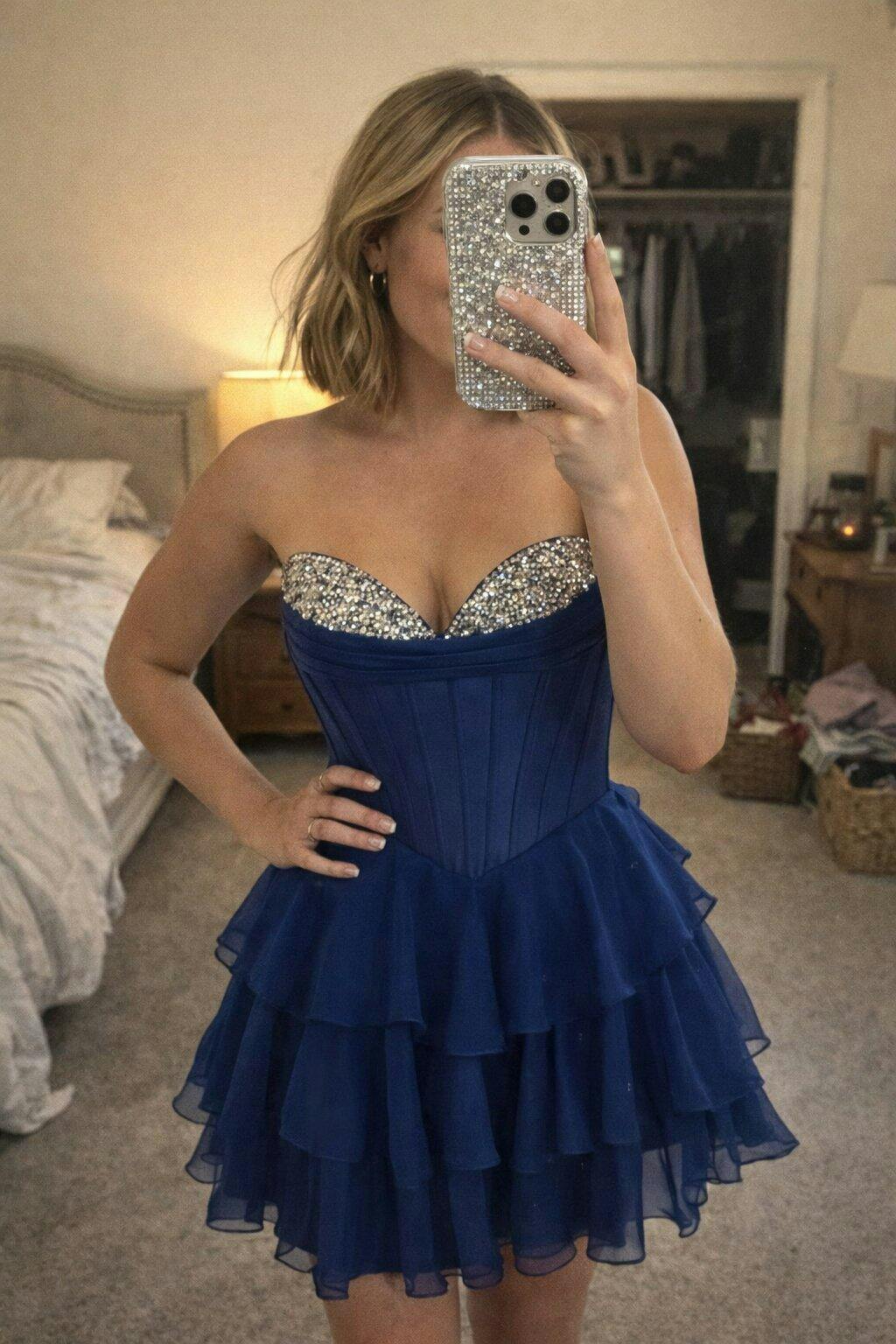 A-Line Sweetheart Neck Short/Mini Royal Blue Tiered Homecoming Dress with Beaded Bodice