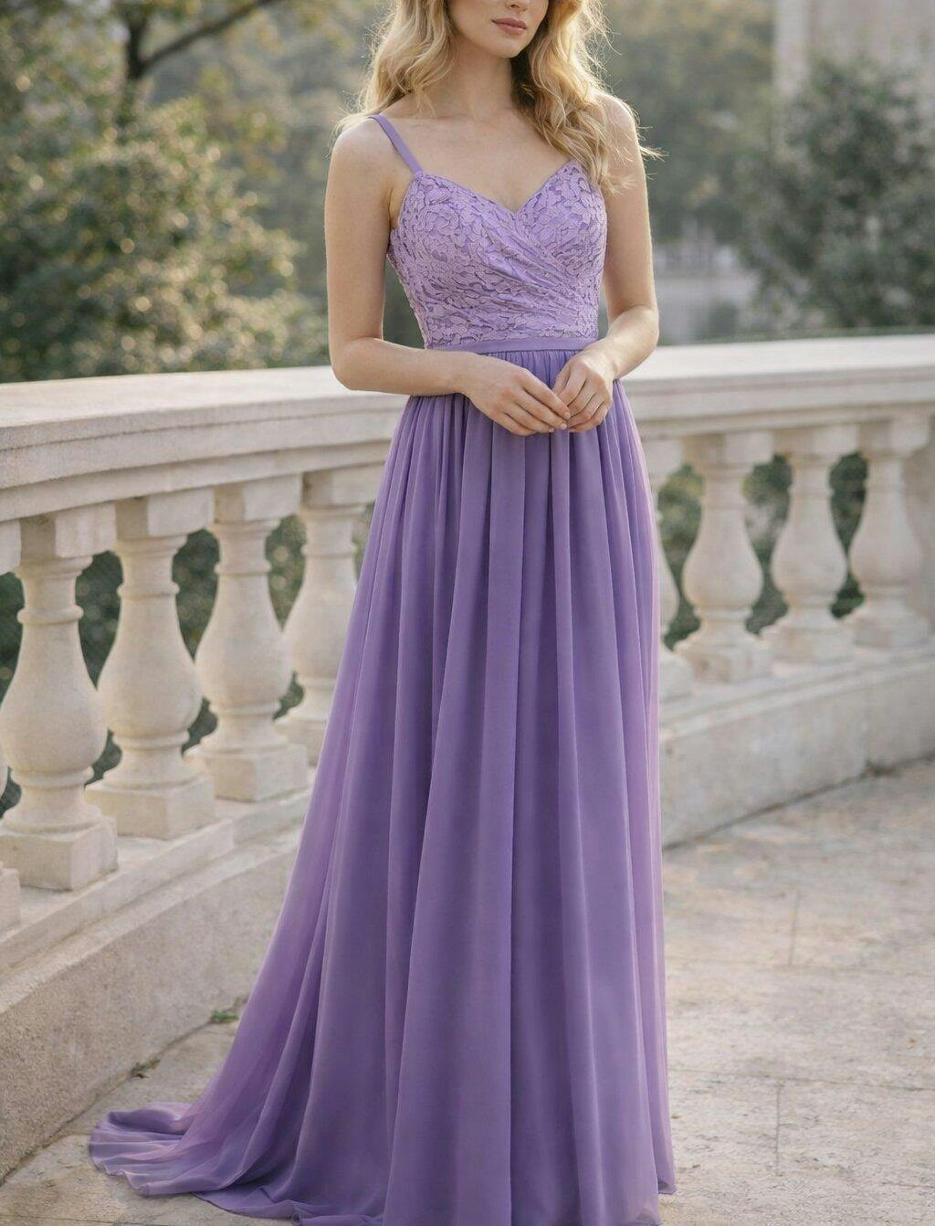 This charming prom dress combines a delicately ruched lace bodice with slim spaghetti straps for a feminine and graceful look. The soft chiffon skirt flows effortlessly to the floor, adding movement and elegance with every step. Romantic yet simple, this gown offers a timeless silhouette that flatters beautifully—perfect for prom nights, evening occasions, and formal celebrations.