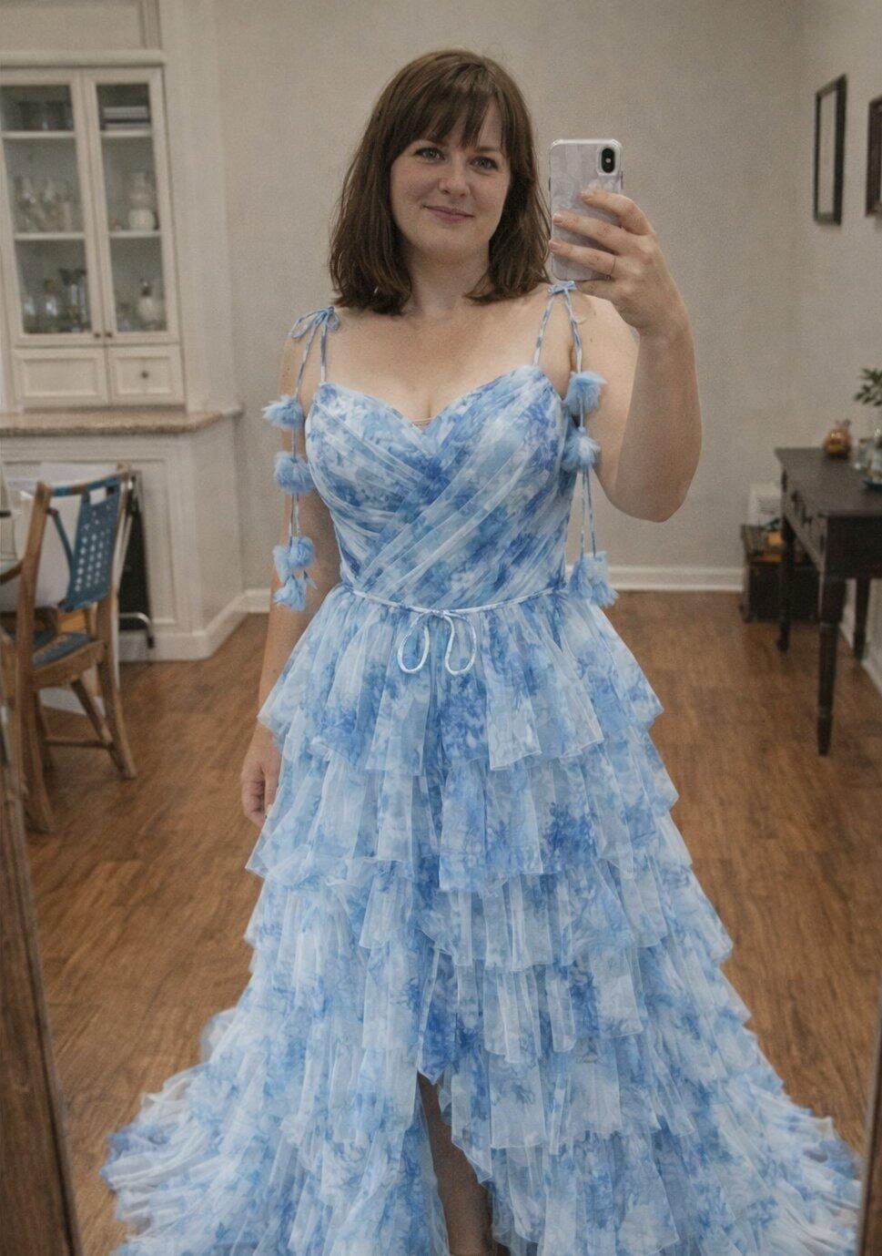 Crafted entirely from lightweight tulle, the floor-length skirt is finished with cascading tiered ruffles that create airy volume and elegant movement. Delicate spaghetti straps adorned with floral ties add a whimsical, feminine touch, making this gown perfect for prom nights, formal events, or any occasion that calls for a dreamy statement look.