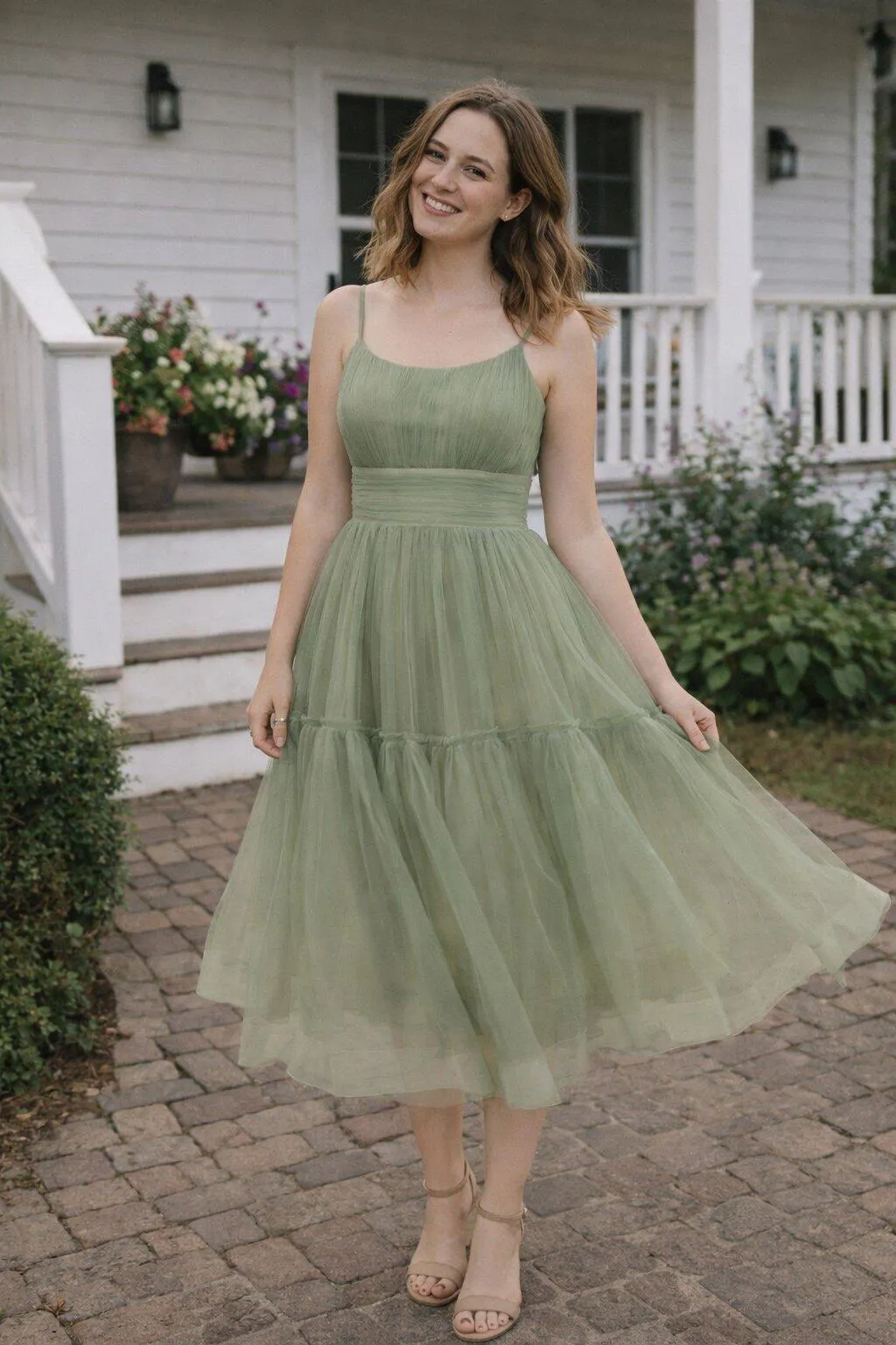 This sage green tulle prom dress offers a fresh, airy take on timeless elegance. Designed in a flattering A-line silhouette, it features a soft scoop neckline that highlights the collarbone while maintaining a clean, effortless look. The delicate spaghetti straps add lightness to the bodice, creating a graceful balance between structure and flow.