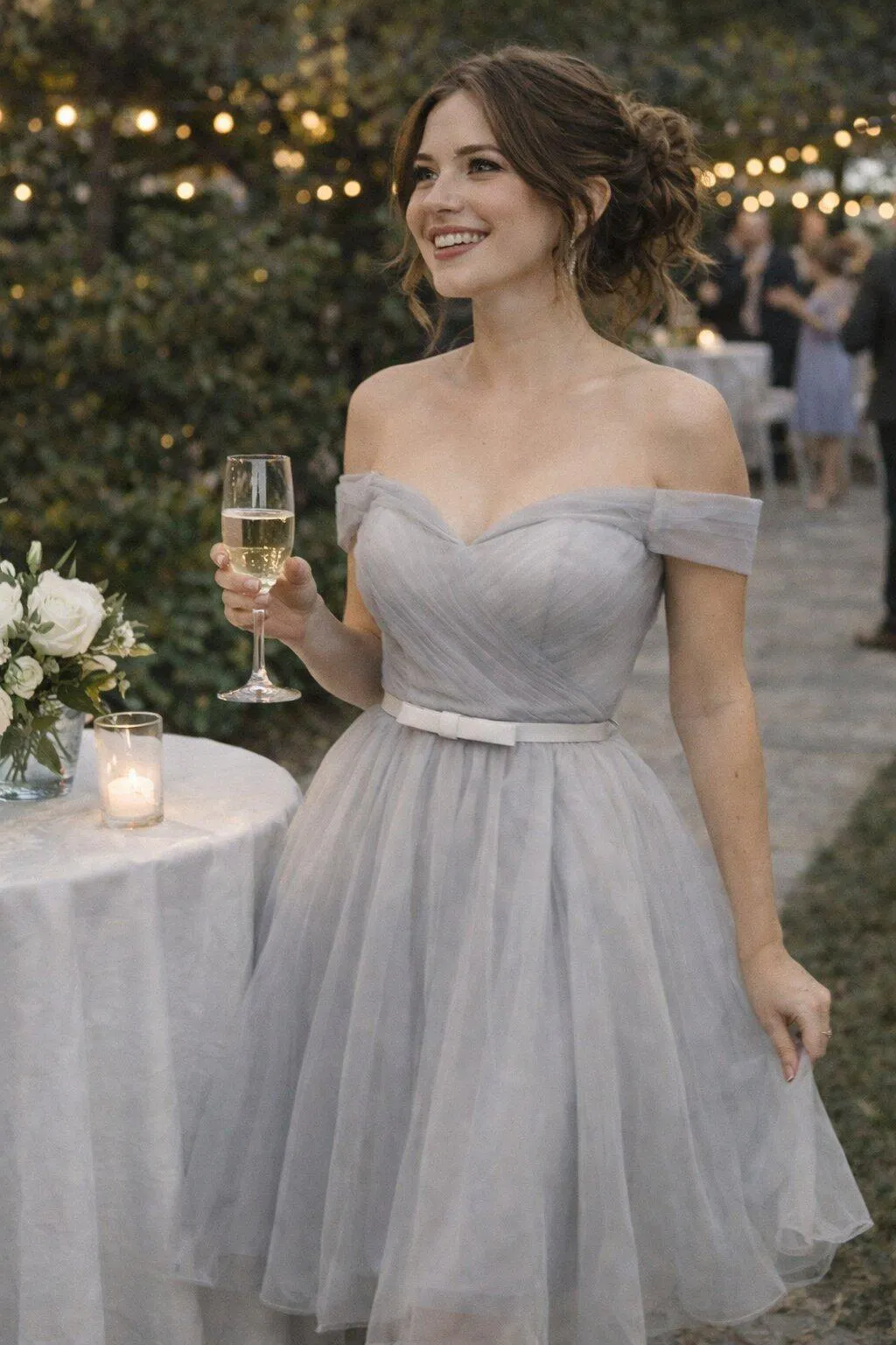 A-line Off-the-Shoulder Knee-Length Tulle Dress with Pleated Bodice Homecoming Dress