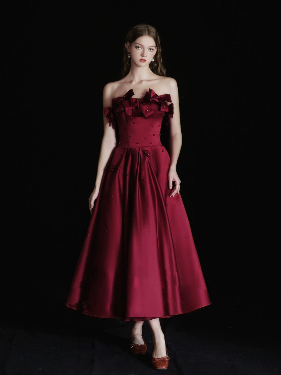 This elegant tea-length homecoming dress features a timeless A-line silhouette that flatters the figure with effortless grace. Crafted from smooth satin, the skirt drapes beautifully while maintaining a structured, polished look ideal for formal occasions and evening events.