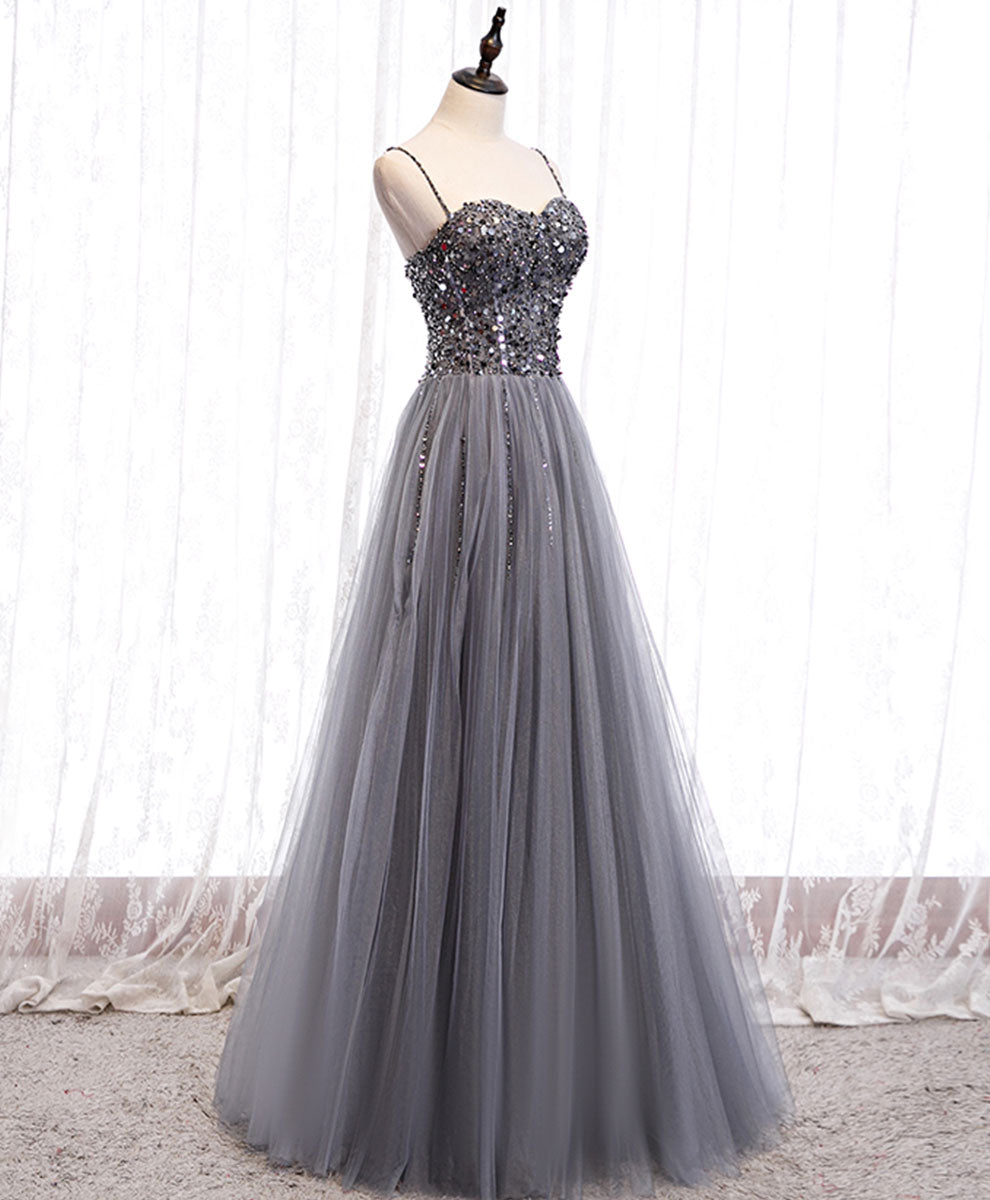 A-Line Sweetheart Neck Floor-Length Gray Tulle Sequin Prom Dress with Beaded Bodice