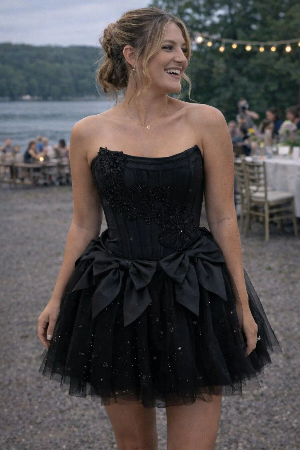 A-Line Strapless Short/Mini Tulle Black Homecoming Dress with Bow Detail
