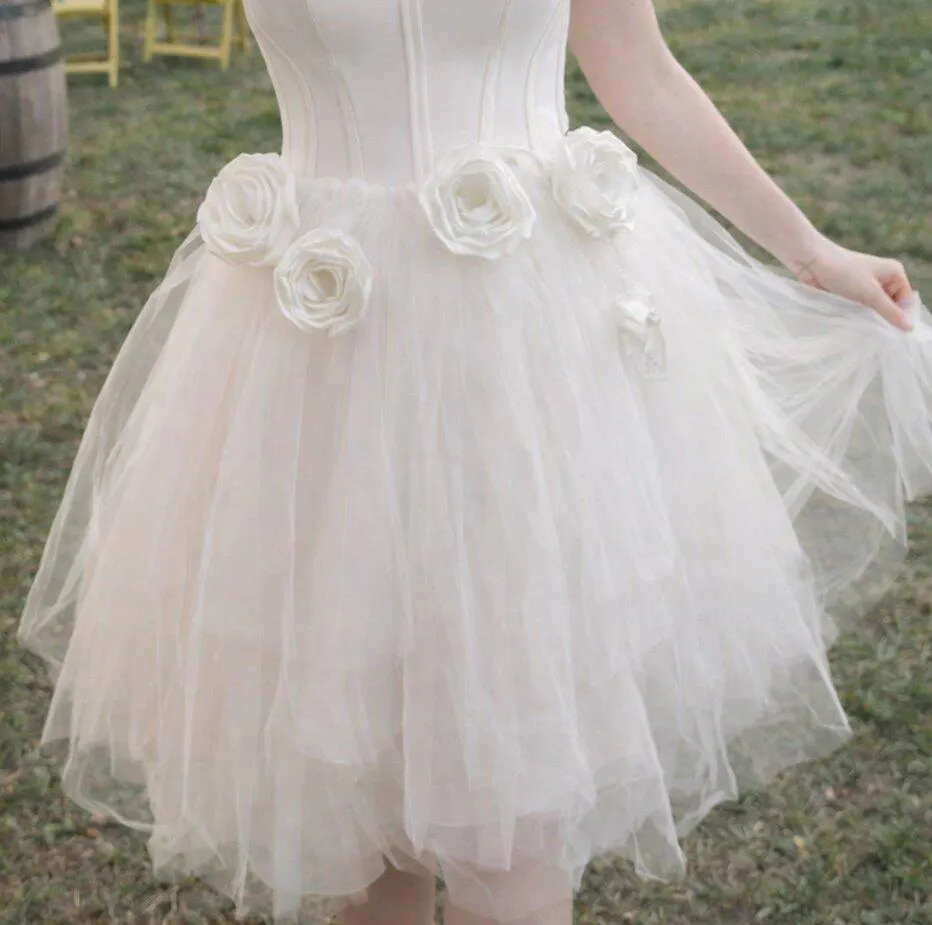 Layers of airy tulle are paired with smooth satin accents, adding dimension and movement to every step. Delicate 3D floral appliqués at the waist introduce a subtle couture-inspired detail, enhancing the dress without overpowering its refined aesthetic.
