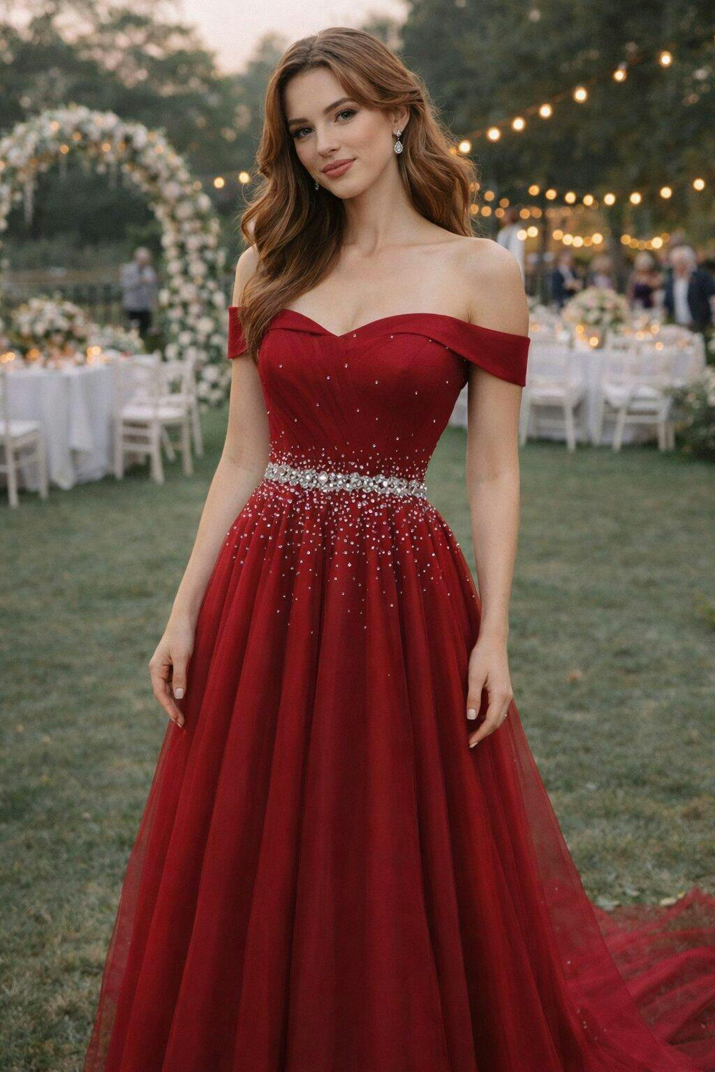 Step into the spotlight with this stunning off-the-shoulder A-line prom dress. Featuring a flattering sweetheart neckline, this dress is adorned with shimmering beads that accentuate the waistline and create a luxurious effect. The floor-length tulle skirt flows gracefully, adding a romantic touch to this elegant design. Perfect for prom, homecoming, or any formal event, this dress combines glamour with timeless sophistication.