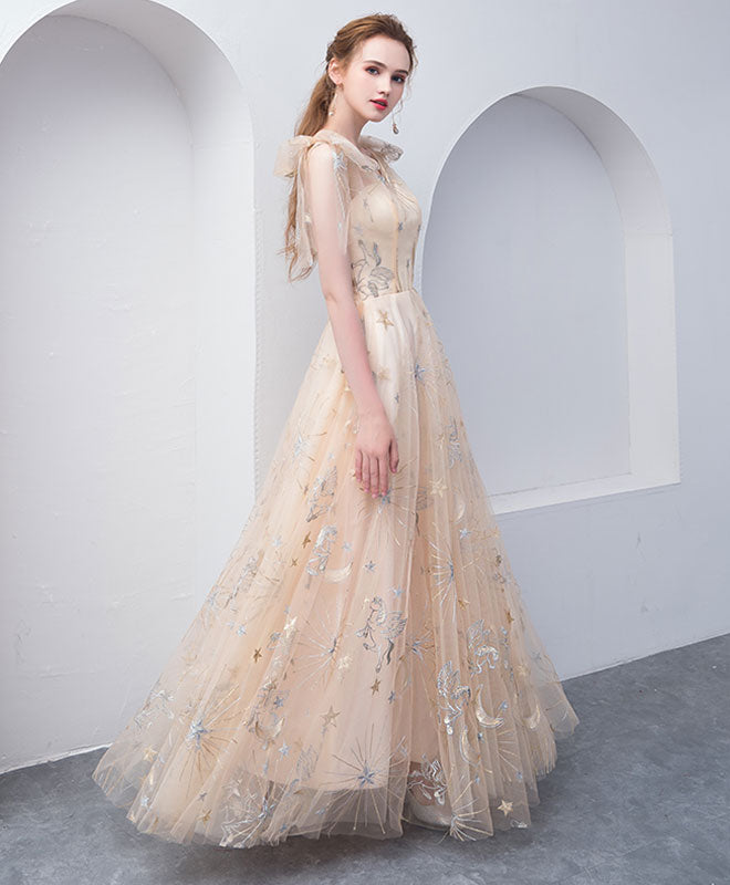 A magical A-line prom dress featuring a flattering V-neckline and delicate lace bodice. The soft tulle skirt cascades gracefully to the floor, adorned with intricate star and celestial embroidery for a whimsical, enchanting look. Perfect for prom, formal events, or any special occasion seeking a blend of elegance and fairy-tale charm.