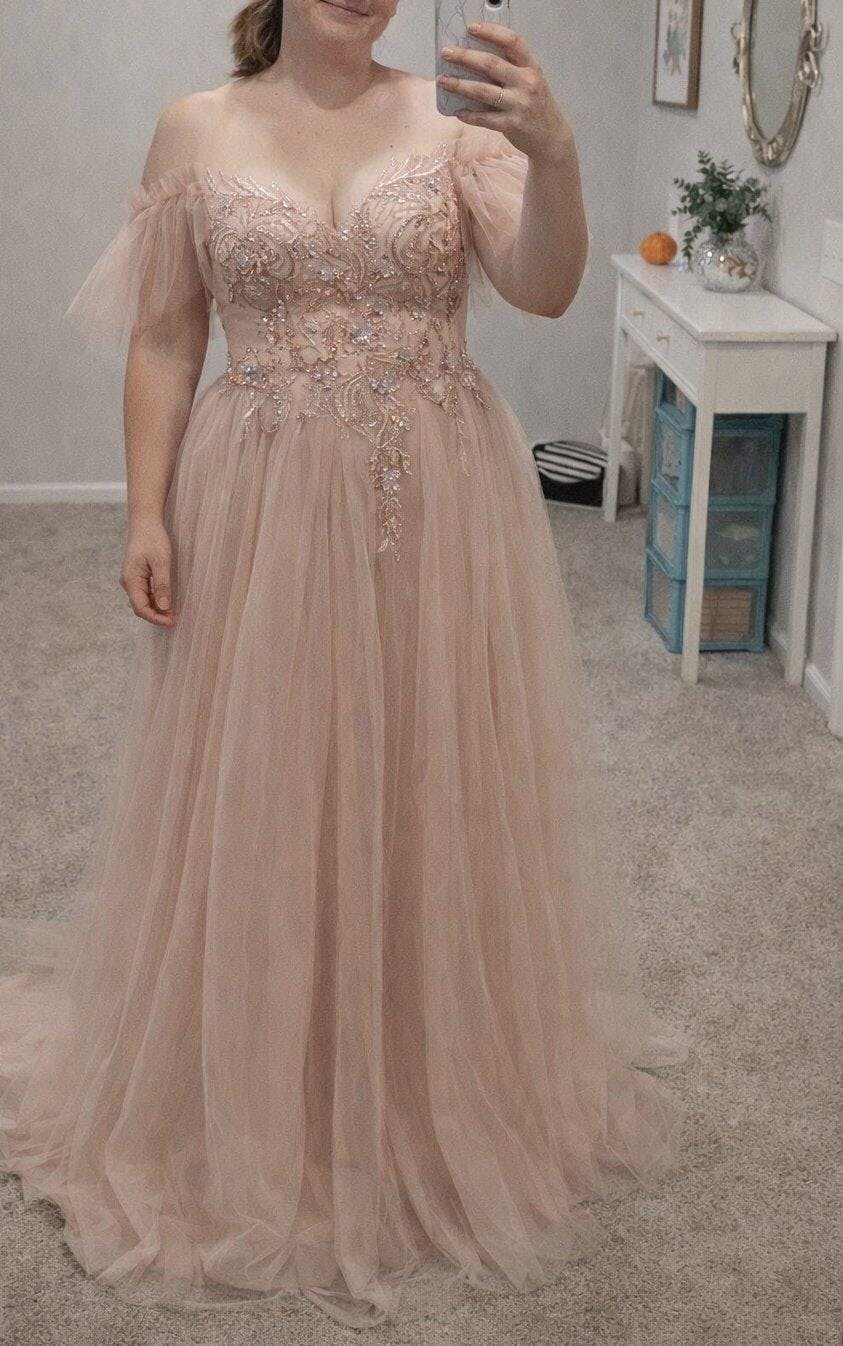This blush prom dress delivers a romantic, refined look through delicate detailing and graceful movement. Designed in a flattering A-line silhouette, the gown softly skims the waist before flowing into a full-length tulle skirt, creating an elegant and airy presence from every angle.