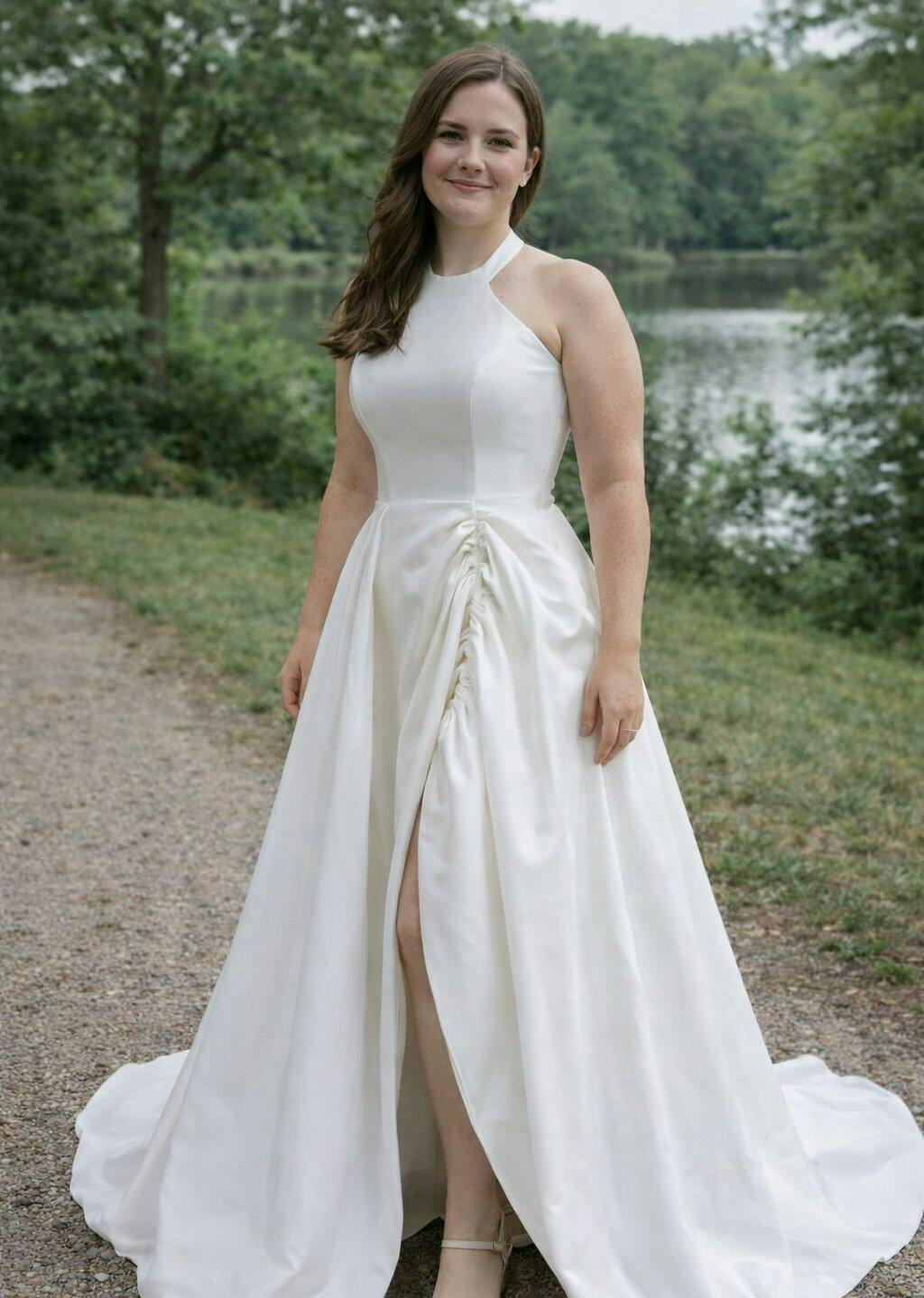 A-Line High Neck Satin Wedding Dresses with Sleeveless Design Pleated Skirt and Chapel Train