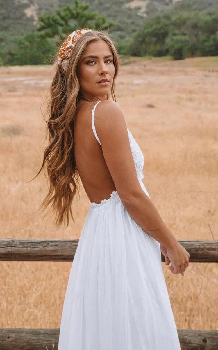 A Line Spaghetti Chiffon Lace Floor-length Sleeveless Wedding Dress