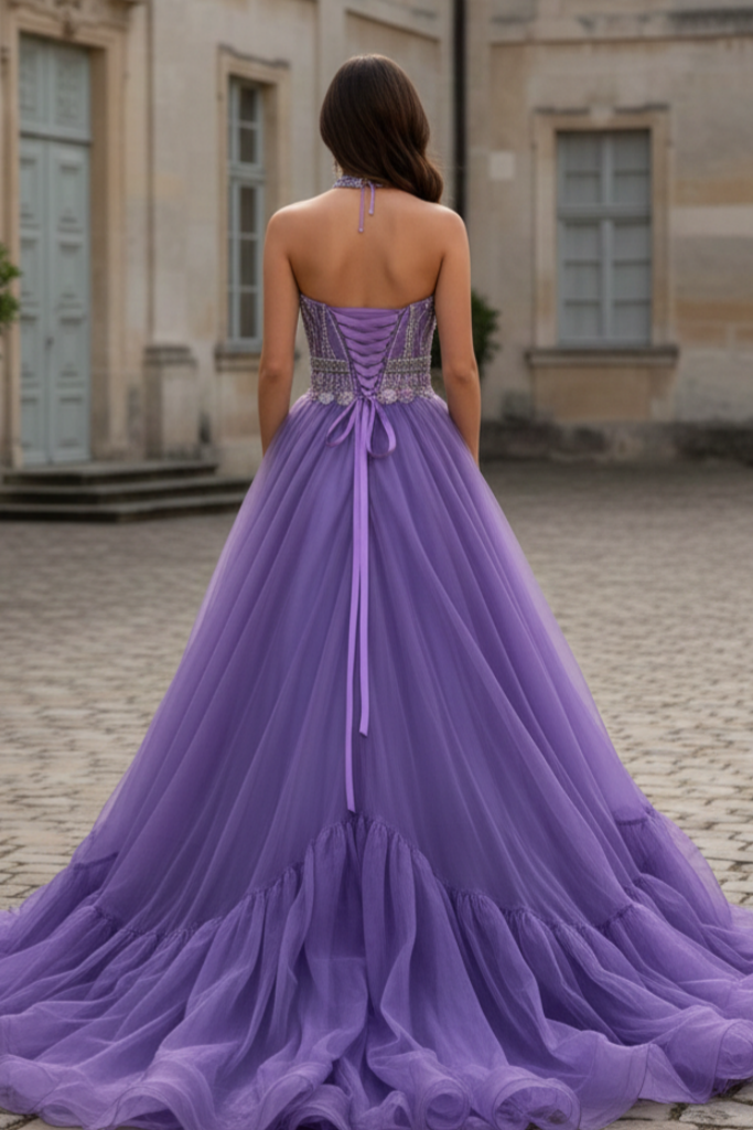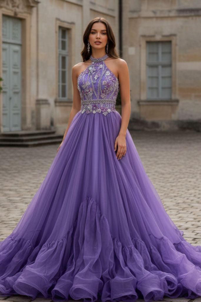 Ball Gown Halter Back Floor-Length Tulle Prom Dress with Sparkling Beaded Bodice and Tiered Ruffle Skirt
