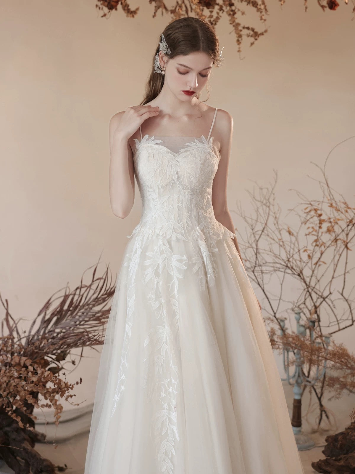 This ivory prom dress captures a soft, romantic elegance with its flowing A-line silhouette and delicately detailed bodice. The sheer square neckline is accented with refined lace appliqué, creating a graceful layered effect that feels light, feminine, and effortlessly elegant. Slim spaghetti straps add subtle structure while keeping the look airy and refined.