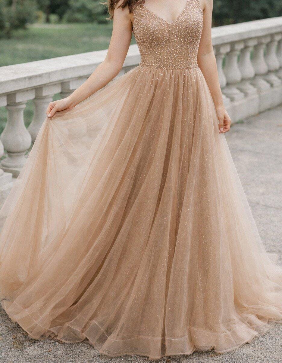 This elegant A-line prom dress showcases a timeless V-neck silhouette paired with a delicately beaded lace bodice that adds refined sparkle without feeling overwhelming. The fitted upper design highlights the waist and creates a flattering, elongated line, while the flowing floor-length tulle skirt drapes softly for a light and graceful finish. Subtle shimmer woven throughout the skirt enhances movement under the light, making every step feel effortless and ethereal. The clean, sleeveless cut keeps the look modern and versatile, allowing the intricate texture and craftsmanship to stand out. Perfect for prom nights, formal galas, or evening celebrations, this gown balances sophistication and romance, offering a polished statement that feels both classic and contemporary.