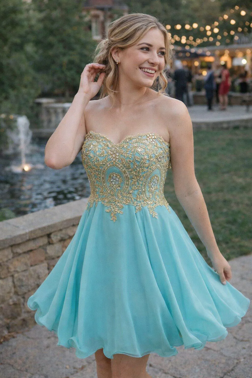 Chic and playful, this A-line homecoming dress features a sweetheart neckline and an intricately embroidered lace bodice adorned with shimmering gold accents. The light and airy chiffon skirt flows beautifully with every movement, finishing at a flirty knee length for youthful charm. A lace-up back ensures an adjustable, flattering fit, making this dress perfect for parties, dances, and special celebrations.