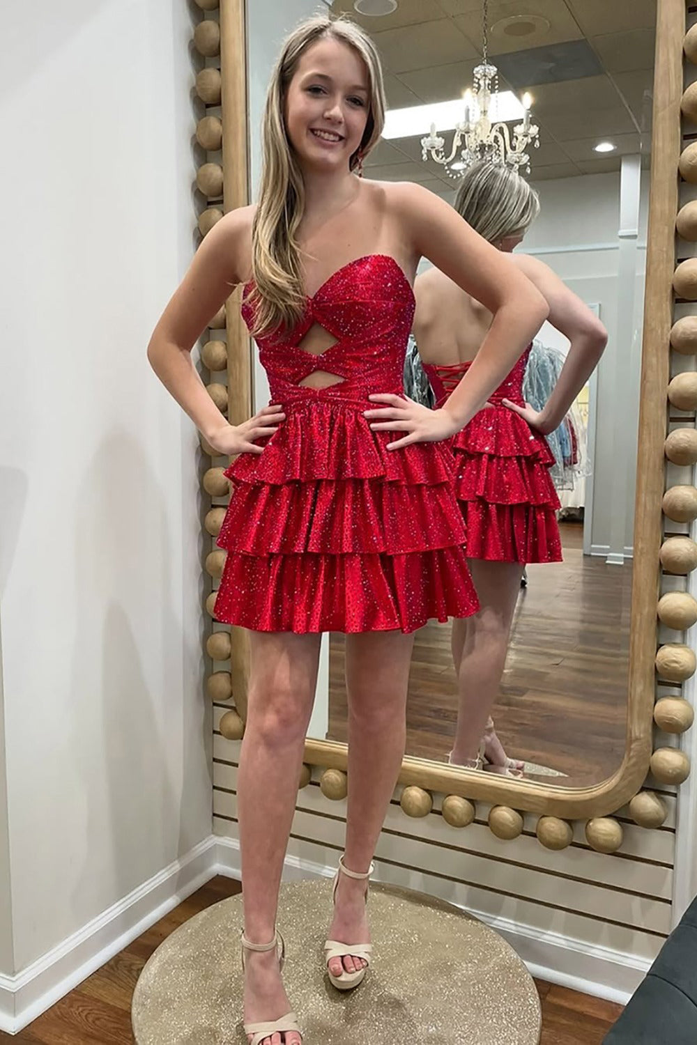 A-Line Sweetheart Neck Short/Mini Red Glitter Homecoming Dress with Cutout Bodice and Tiered Skirt