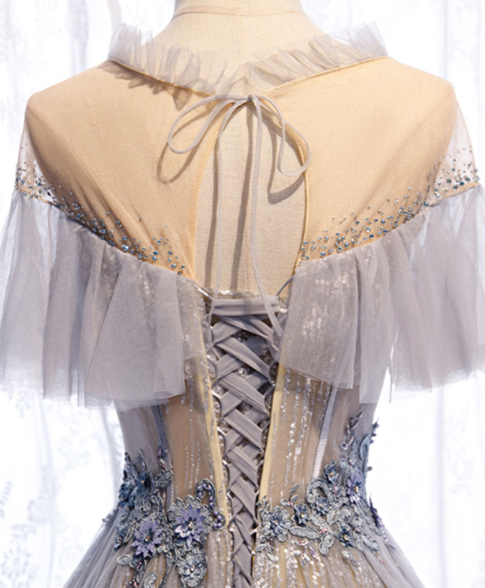 A-Line Misty Gray Illusion Neck Floor-Length Tulle Lace Prom Dress with Ruffled Cape Sleeves and Beaded Waist