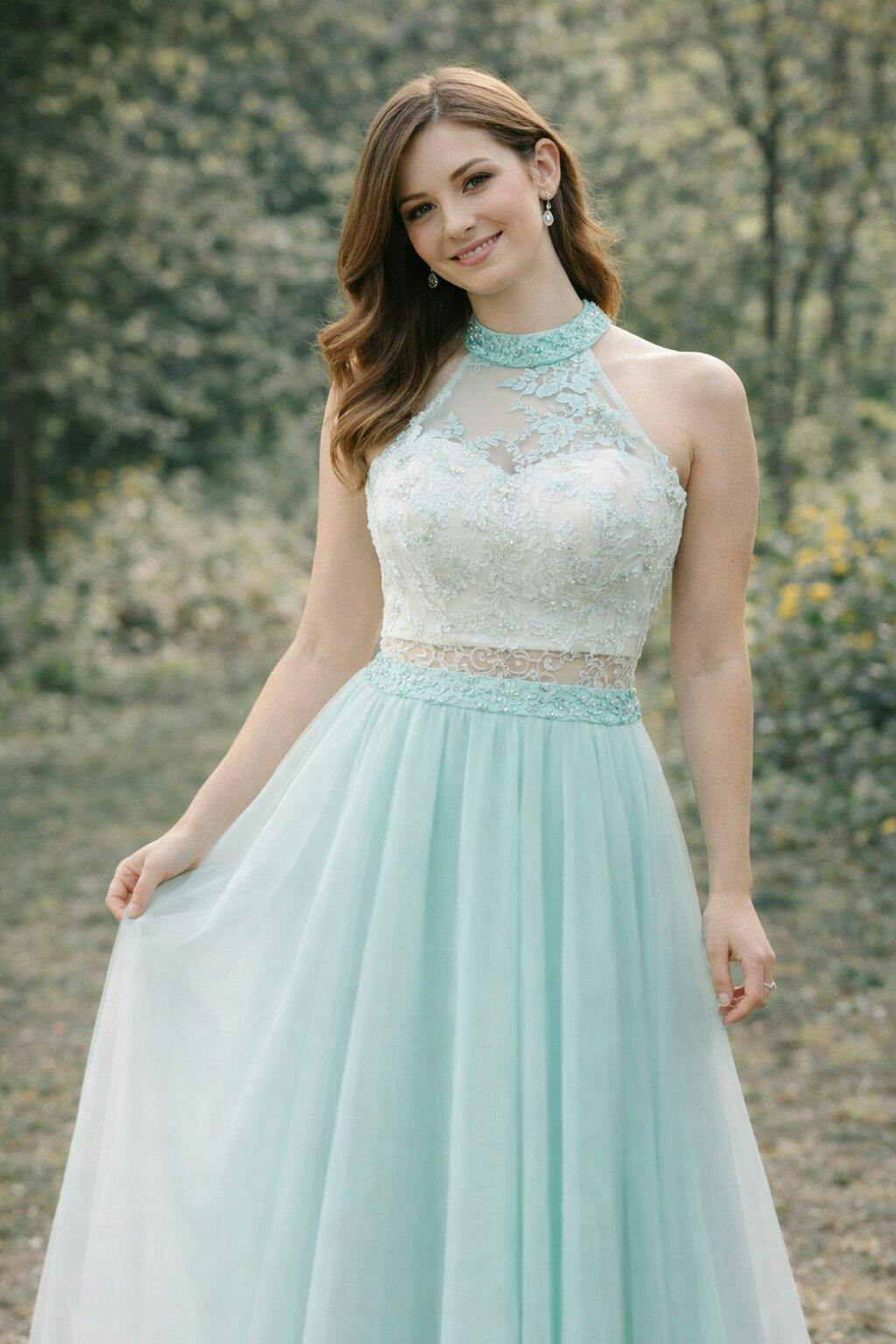 A dreamy prom gown featuring an illusion halter neckline and a lace-embellished bodice that subtly reveals skin for a refined yet modern appeal. The beaded waistband defines the silhouette while the airy tulle skirt flows softly with every step. Elegant, fresh, and feminine — perfect for prom nights, banquets, or formal celebrations.