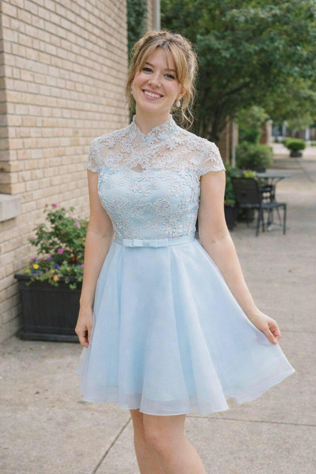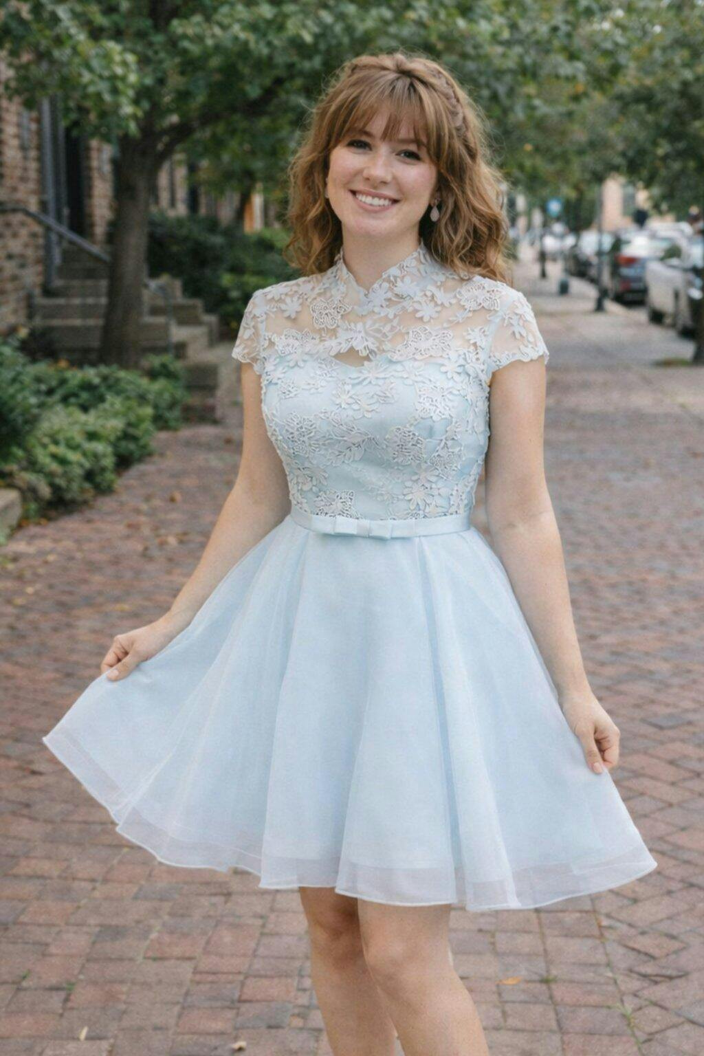 Capture an angelic glow at your Homecoming or Prom in this dreamy pastel blue dress. Designed with a delicate high neckline and cap sleeves, the dress features intricate floral lace appliqués over a sheer bodice, balancing elegance with youthful charm.