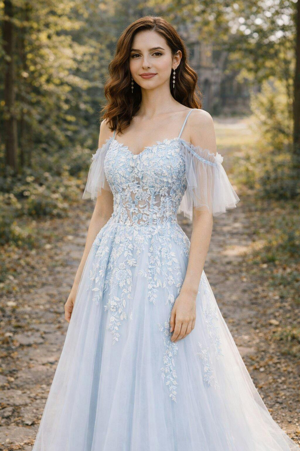 A romantic A-line prom dress featuring a flattering sweetheart neckline that beautifully highlights the bust and shoulders. Crafted from airy tulle layered with delicate lace, the floor-length skirt flows effortlessly for a light, ethereal silhouette. Spaghetti straps are paired with soft cold-shoulder sheer sleeves, adding movement and a dreamy touch. Finished with a lace-up back for an adjustable, flattering fit — perfect for prom, formal evenings, or fairy-tale celebrations.