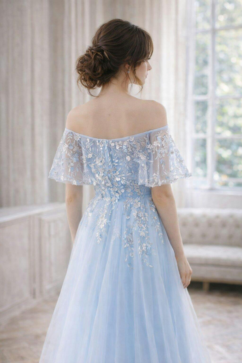 Softly romantic and effortlessly graceful, this A-line prom dress showcases a classic scoop neckline that gently curves across the bodice, offering a modest yet feminine silhouette. Layers of airy tulle paired with fine lace detailing create dimension and movement, while the floor-length skirt delivers an elegant sweeping effect perfect for evening occasions, prom, or formal celebrations. The lace-up back provides an adjustable fit that enhances the waistline, and the built-in bra ensures structure and comfort throughout the night. Refined and timeless, this gown captures modern fairy-tale charm with polished sophistication.