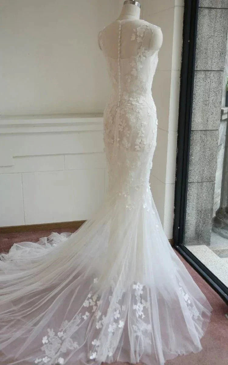 Mermaid Sleeveless Lace Appliques Covered-Button Tulle Wedding Dress