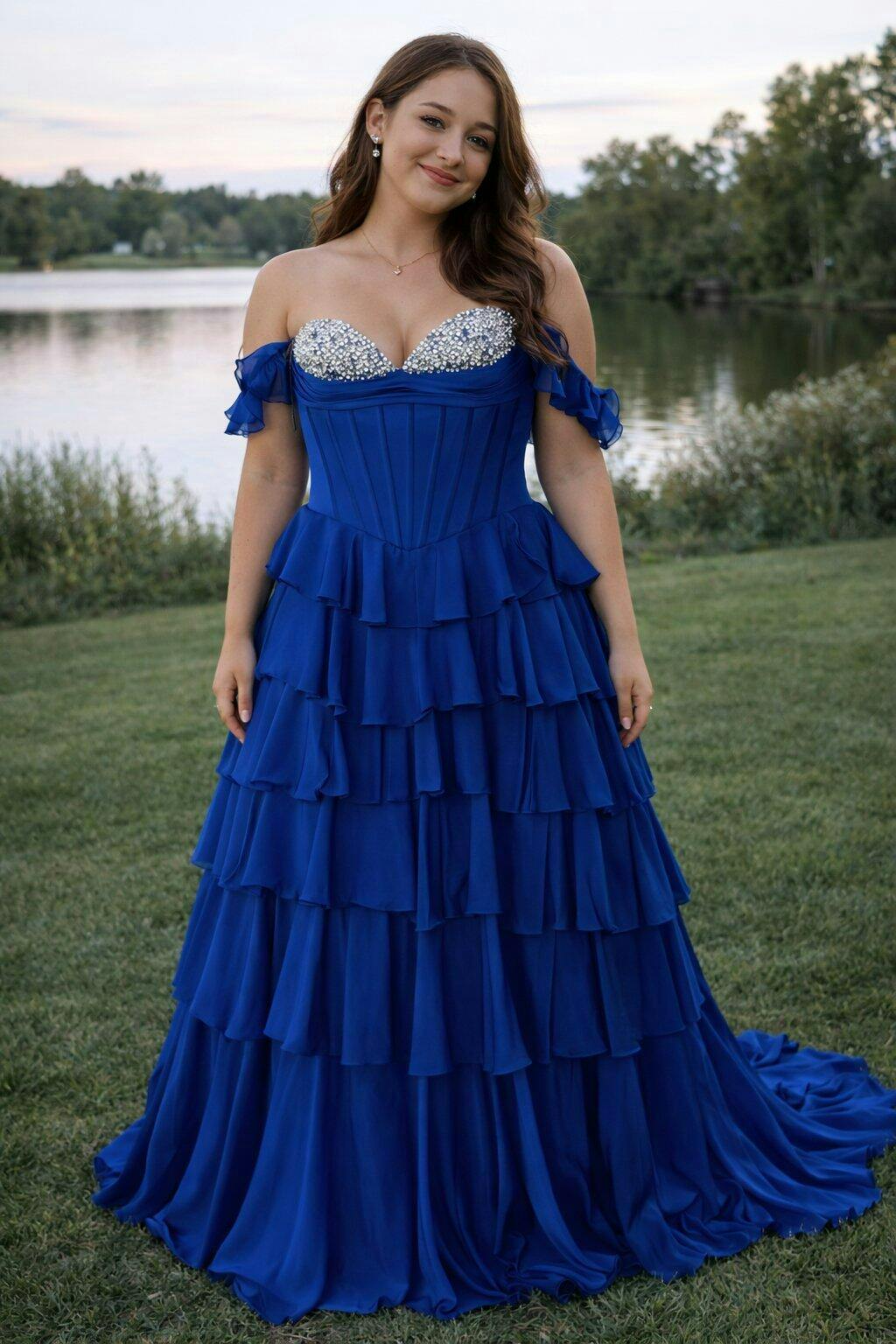 Flowing into a full floor-length skirt, the dress features cascading tiered tulle layers that create volume, movement, and a show-stopping presence from every angle. The vibrant royal blue hue elevates the look with confidence and elegance, making this gown an ideal choice for prom night, formal galas, or any occasion where you want to stand out with classic glamour and youthful drama.