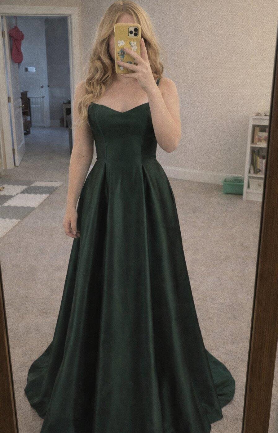 This dark green satin prom dress delivers timeless elegance through clean lines and a refined A-line silhouette. Crafted from lustrous satin, the gown catches the light beautifully, creating a rich, fluid sheen that enhances its sophisticated presence. The fitted bodice flows seamlessly into a floor-length skirt, offering graceful movement while maintaining a flattering, balanced shape.