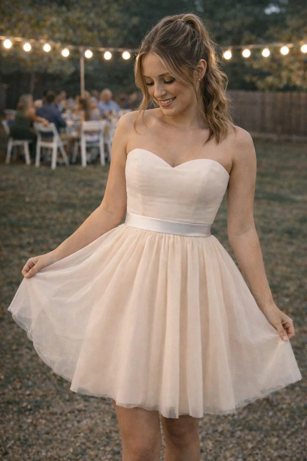 A sweet and timeless A-line homecoming dress featuring a soft sweetheart neckline and a delicately pleated bodice that enhances the natural shape. The airy tulle skirt creates light volume and graceful movement, offering a romantic and feminine look. Simple, elegant, and effortlessly charming — perfect for homecoming, semi-formal events, or any occasion seeking a classic youthful silhouette.