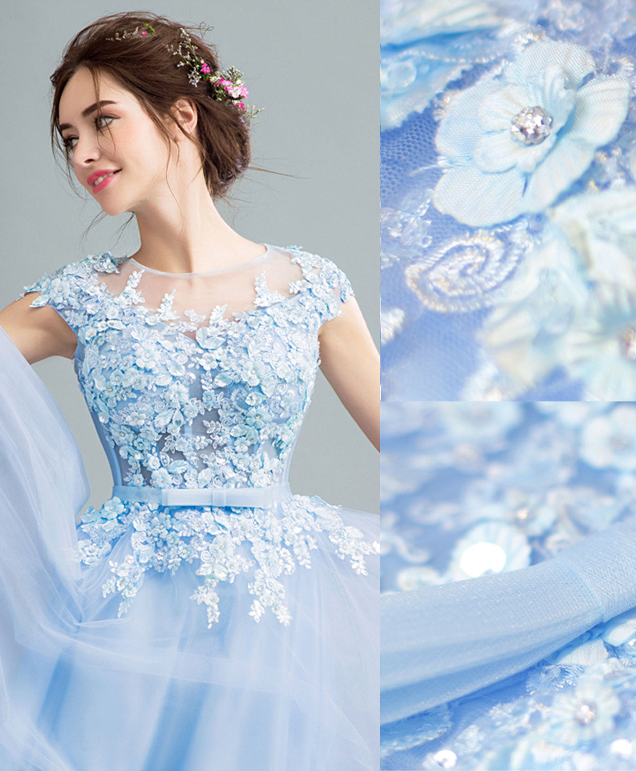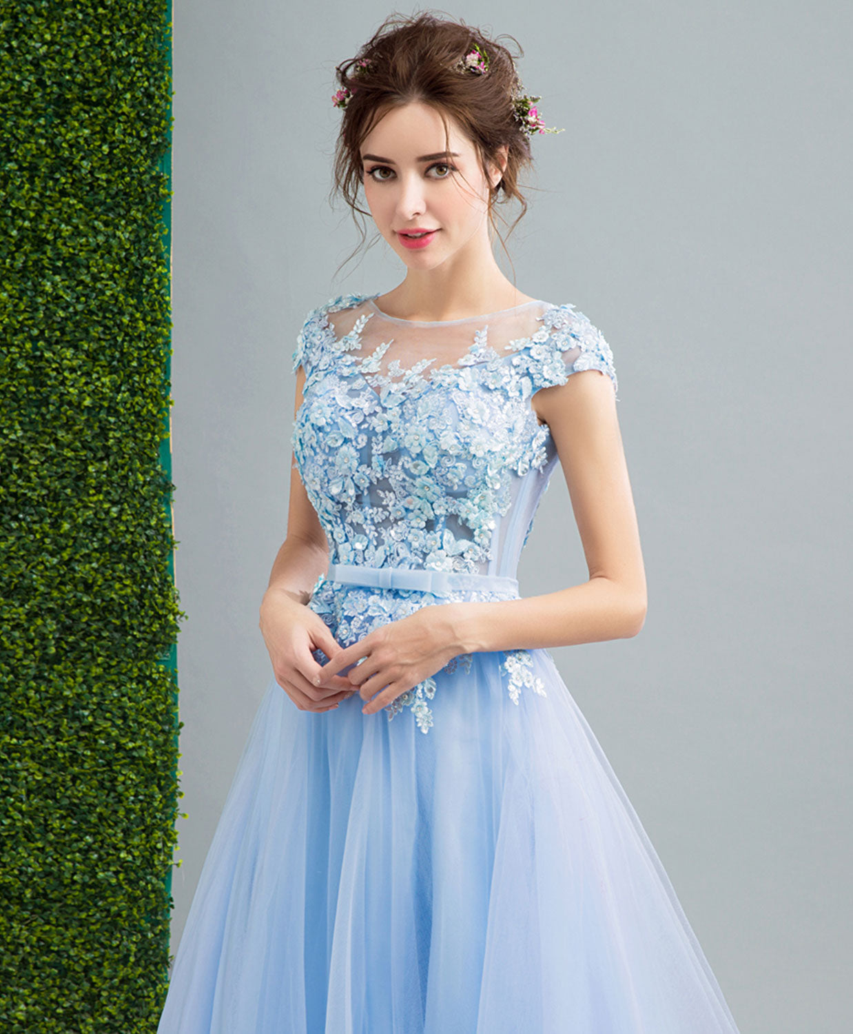 Dreamy and romantic, this blue prom dress features an illusion neckline layered with delicate 3D floral lace appliqué for dimensional elegance. The soft tulle skirt drapes effortlessly to floor length, creating airy movement with every step. Perfect for prom, evening parties, and formal celebrations, this gown delivers a graceful fairytale aesthetic with modern refinement.