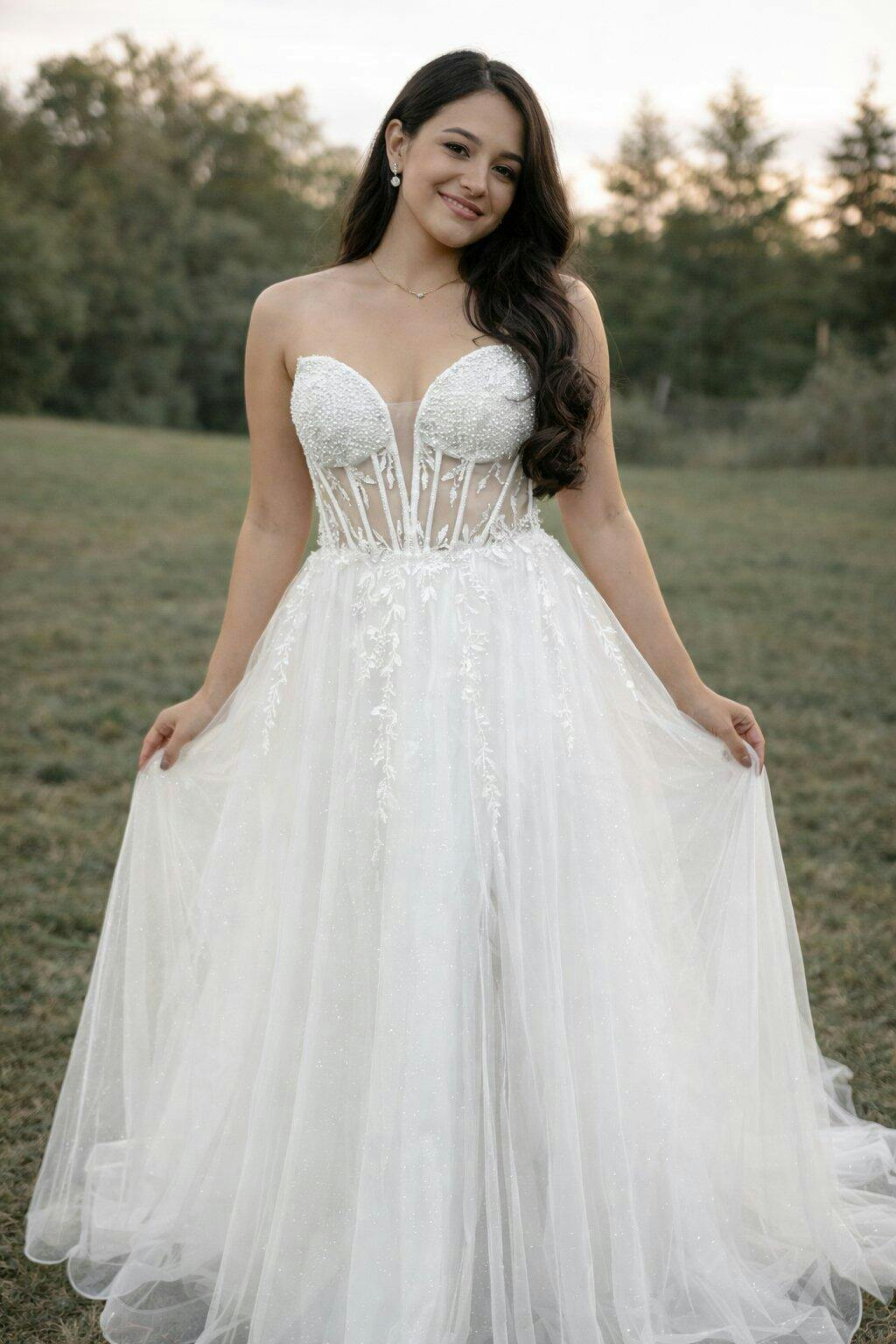 This romantic white prom dress showcases a timeless sweetheart neckline paired with a structured corset bodice, creating a beautifully defined and feminine silhouette. The sheer bodice is delicately adorned with subtle beading, adding a soft shimmer that enhances the dress without overwhelming its elegant design. Vertical boning details visually elongate the figure while offering a refined, couture-inspired look.