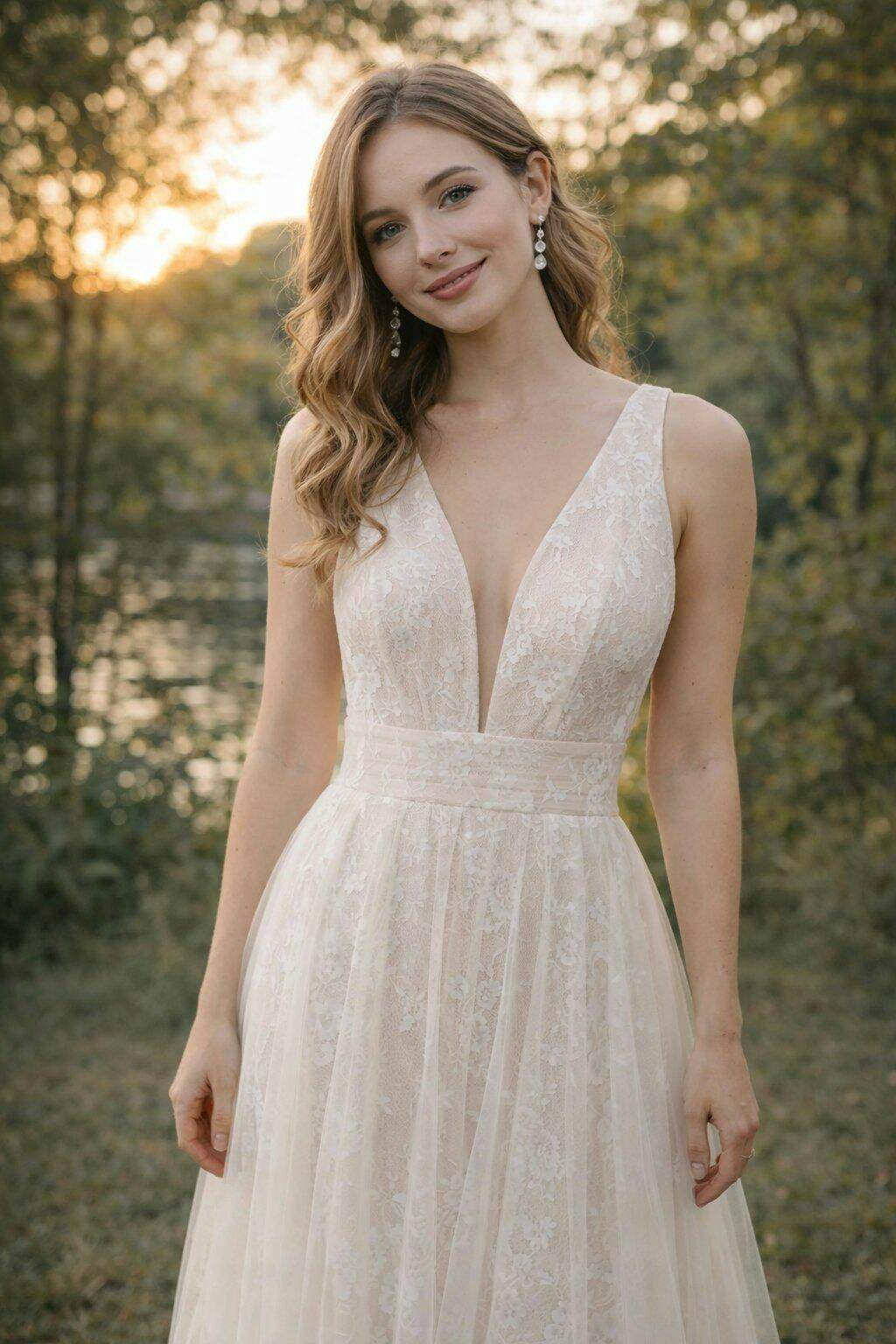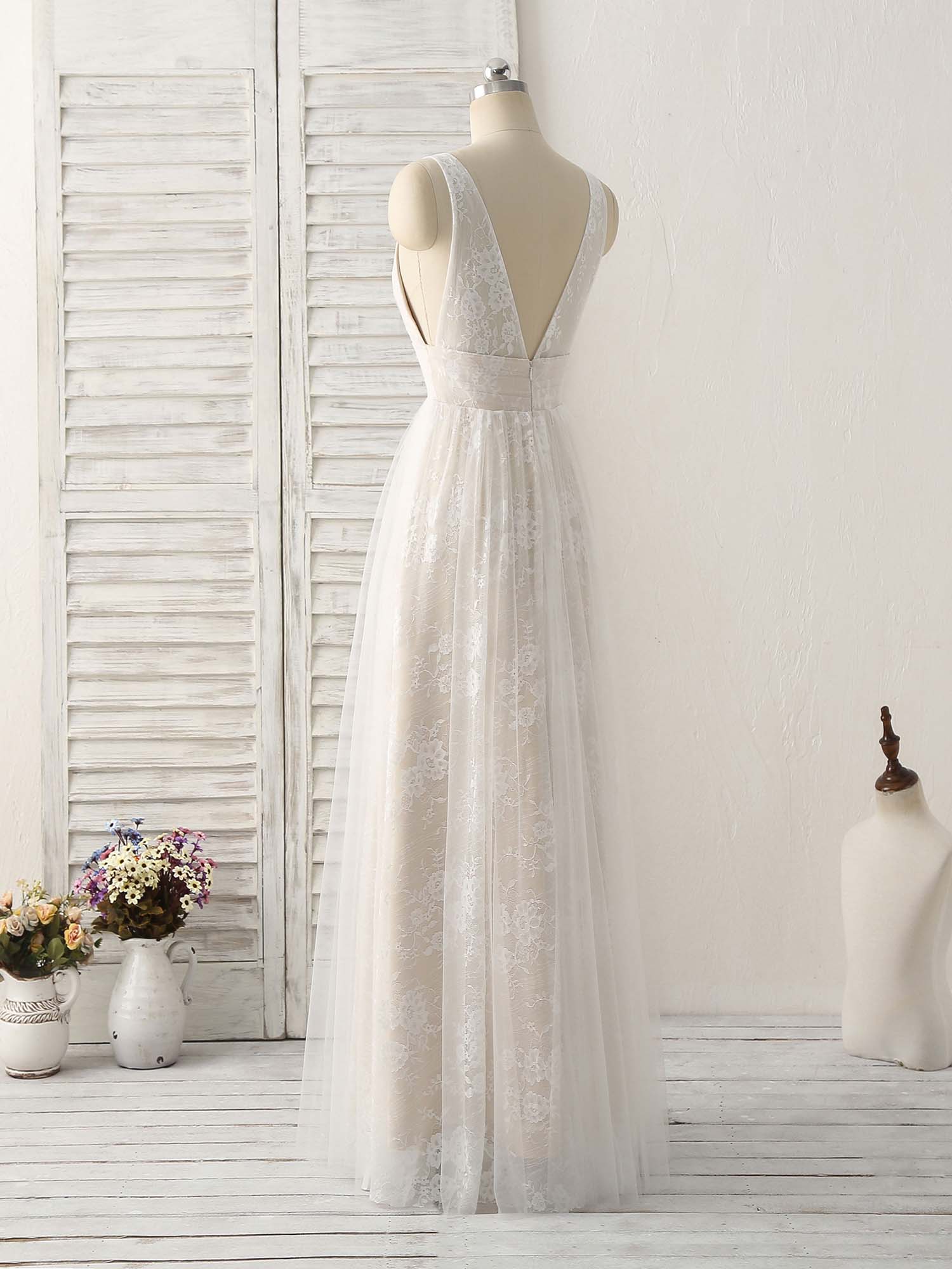 A graceful A-line prom dress featuring a plunging V neckline that elongates the frame and adds modern allure. Soft tulle layered over lace creates a light, ethereal drape, while the sheer bodice detail enhances femininity without overpowering the design. Elegant, refined, and effortlessly romantic — ideal for prom, evening receptions, or formal occasions seeking subtle sophistication.
